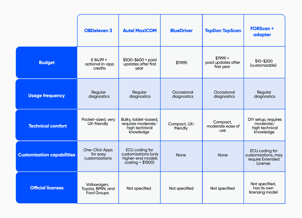 TL;DR: OBDeleven 3 is great for US-made 2008+ Fords, especially for basic diagnostics and easy customizations. Alternatives include BlueDriver and Topdon Topscan. Autel MaxiCOM is better for more advanced functions. Still, FORScan + adapter is best for tech-savvy Ford fans (more budget-friendly too).