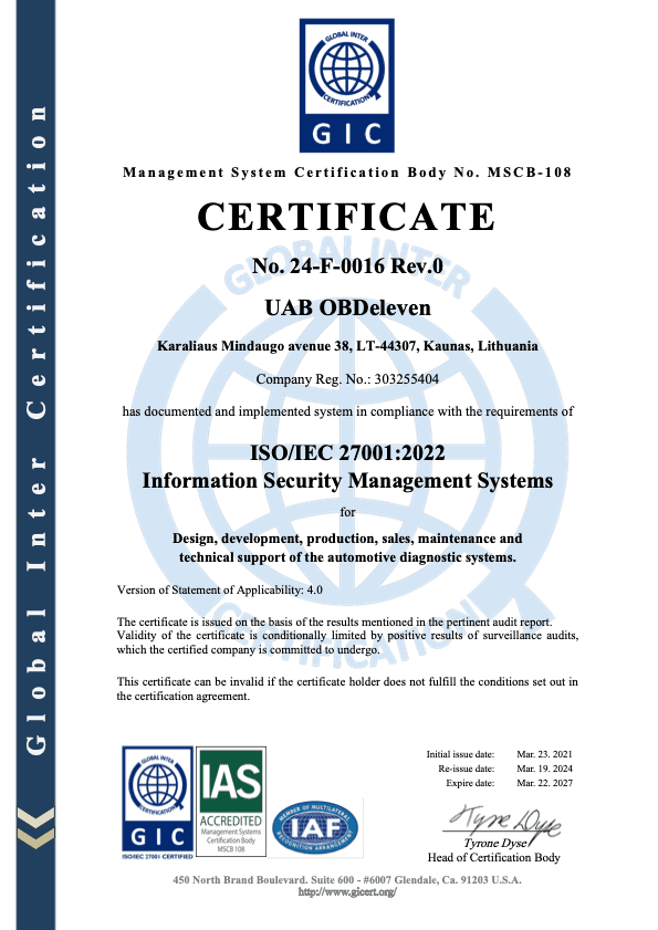 OBDeleven Information Security Management System follows the requirements of the German Automobile Industry Association (VDA ISA) according to the TISAX rating system.
