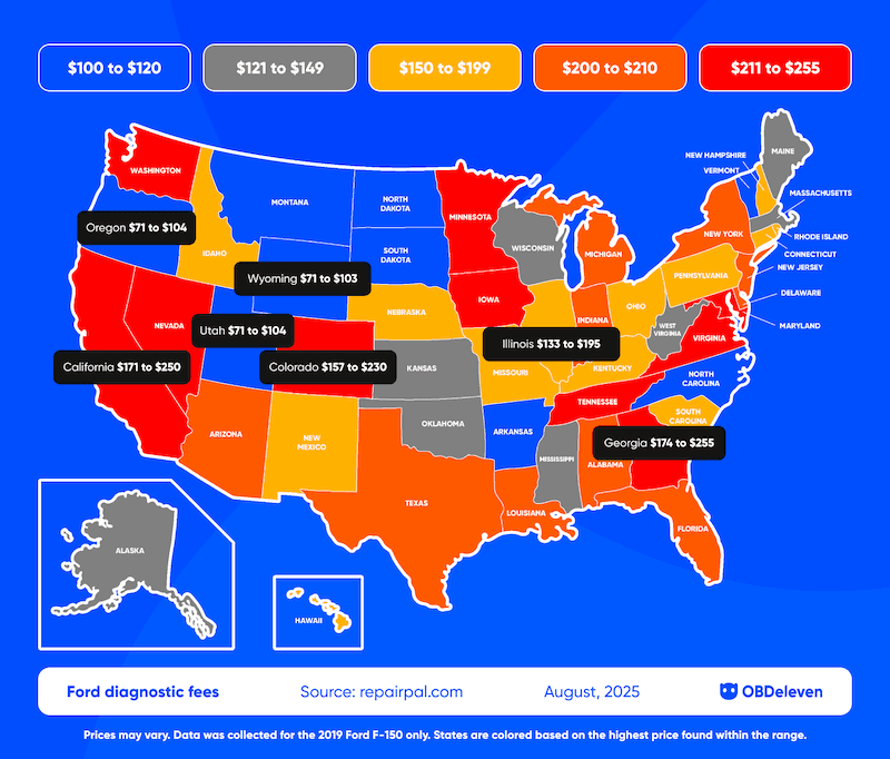 We checked ZIP codes in different US states and mapped an overview showing how much a scan of a 2019 Ford F-150 would cost there: