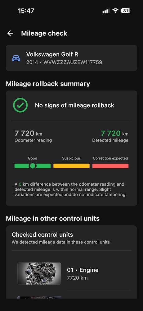 This feature helps avoid odometer fraud by reading data from several control units in your car, comparing the numbers, and alerting of possible rollback on supported Volkswagen Group vehicles and BMW F and G Series models.