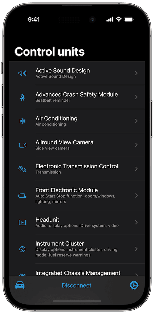 BimmerCode is also a user-friendly app. But, as mentioned previously, it’s more streamlined for BMW. This means long clean lists of manual coding options or pre-made functions, from which you can find a specific one you need. BimmerLink, if compared to its companion, has more visual screens for live data and diagnostic tests.