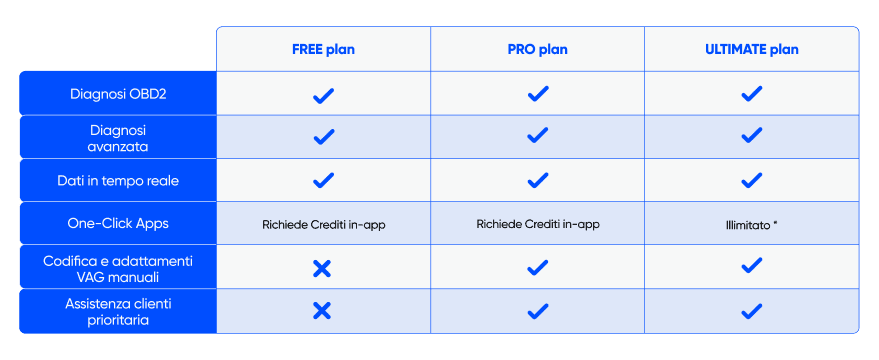 - Alcune funzionalità descritte di seguito possono richiedere un piano PRO o ULTIMATE. La disponibilità dipende anche dalla marca del veicolo, dall’anno di produzione e dalla regione. Scopri di più nelle sezioni Piani e Paesi supportati.