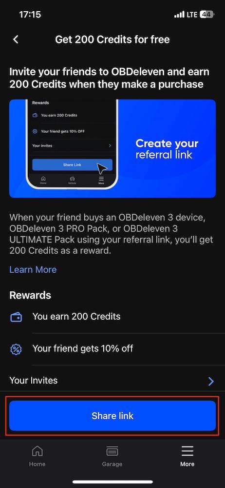 First things first, locate your unique referral link. Simply open the OBDeleven app and navigate to the “More” section in your account. Tap on “Get 200 Credits for free”.