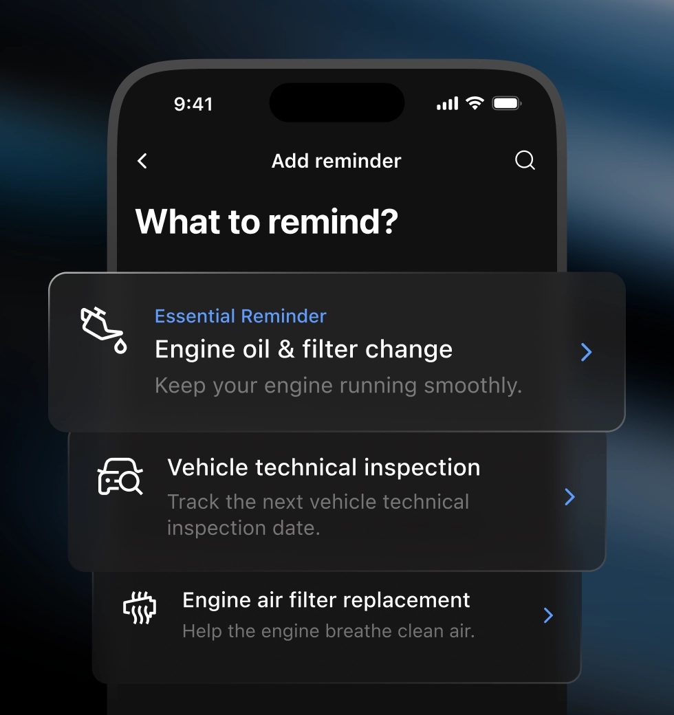 Pick from ready-made reminders or create your own – from part replacements to document renewals. Add notes to keep everything in one place.