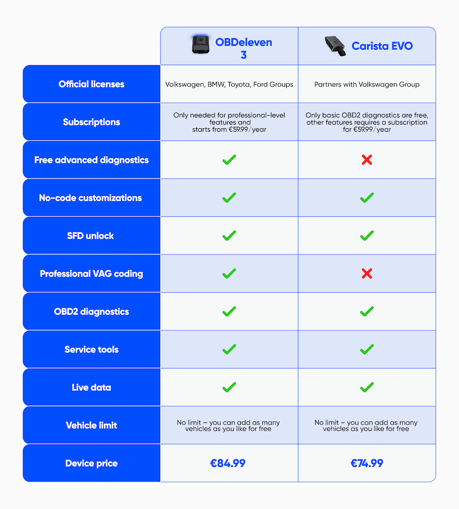 Note: For Carista, no-code customizations, SFD unlock, service tools, and live data features are available with subscription only. For OBDeleven, no-code customizations can be bought on the go and only professional VAG coding requires subscription.